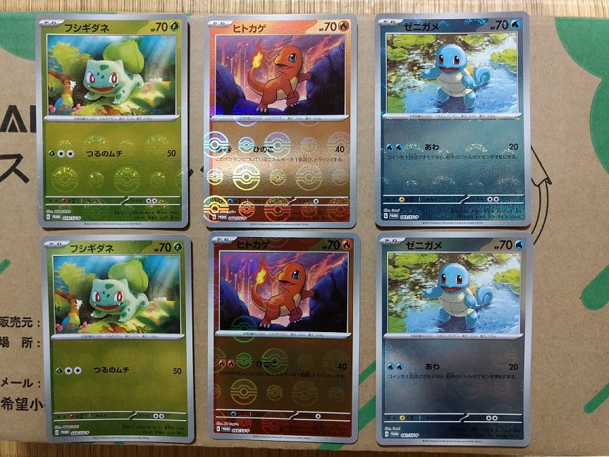 どちらもプロモカードは「フシギダネ」「ヒトカゲ」「ゼニガメ」の3枚で、ポケモンカード151が5パック封入されています。