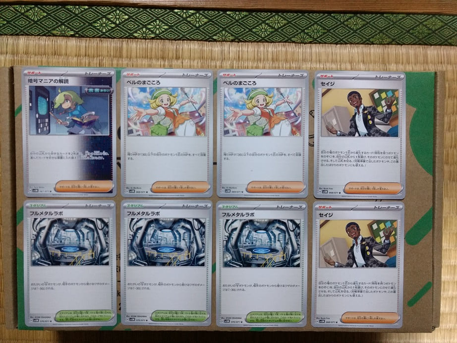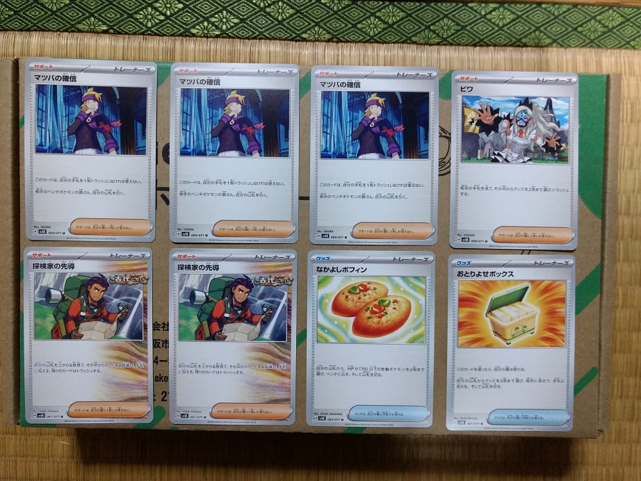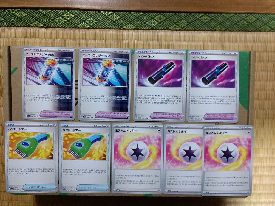 - サポート:5枚、グッズ:2枚、ポケモンのどうぐ:4枚、スタジアム:3枚、エネルギー:3枚