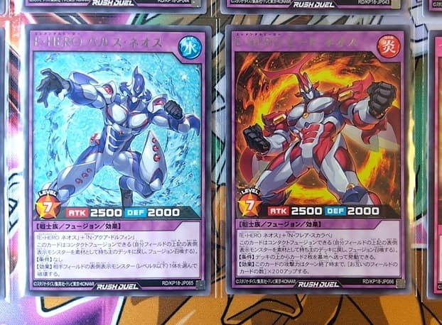 「E・HERO パルス・ネオス」と「E・HERO ヒート・ネオス」はどちらも素材に「E・HERO ネオス(レベル7)」を必要としますが、今弾に収録されている「フェイク・ネオス(レベル4)」が代わりになるので割と出すのは難しくなさそうです。