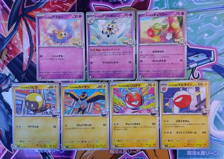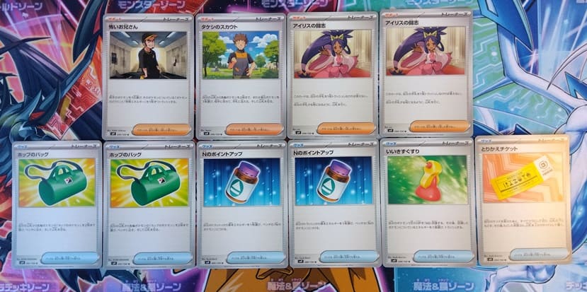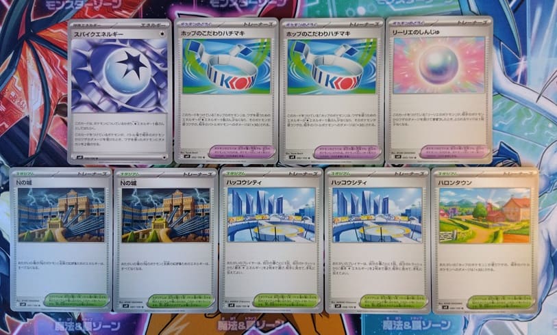 - サポート:4枚、グッズ:6枚、ポケモンのどうぐ:3枚、スタジアム:5枚、エネルギー:1枚