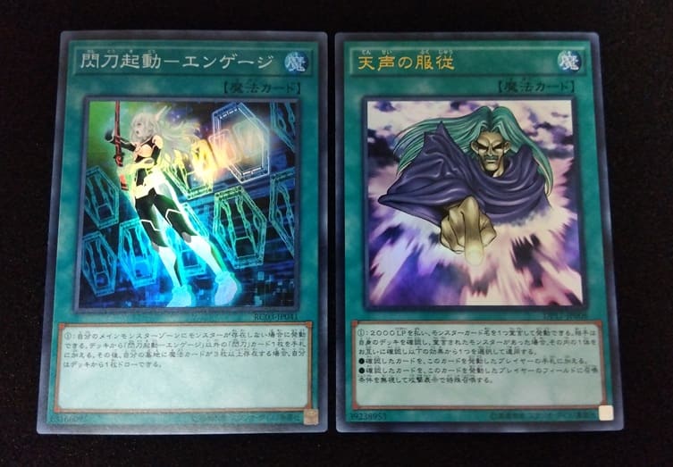 「天声の服従」はデュエリストパック収録のやつで、「閃刀起動-エンゲージ」はレアコレのゴールドエディションに収録されているものになります。